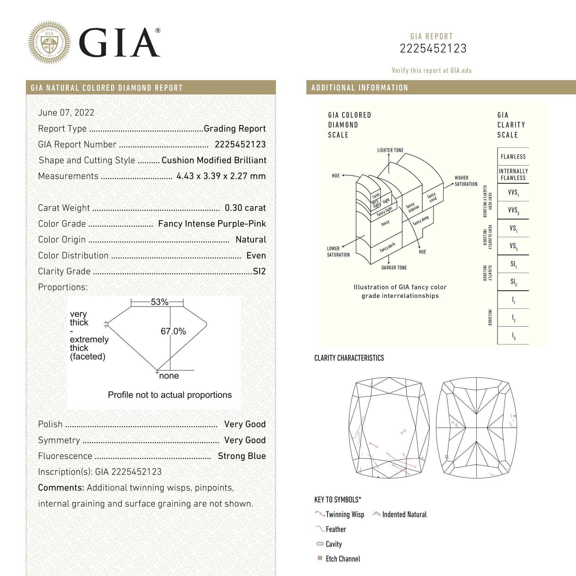 0.30ct 4.43x3.39x2.27mm GIA SI2 Fancy Intense Purple-Pink Cushion Brilliant 🇨🇦 24164-01