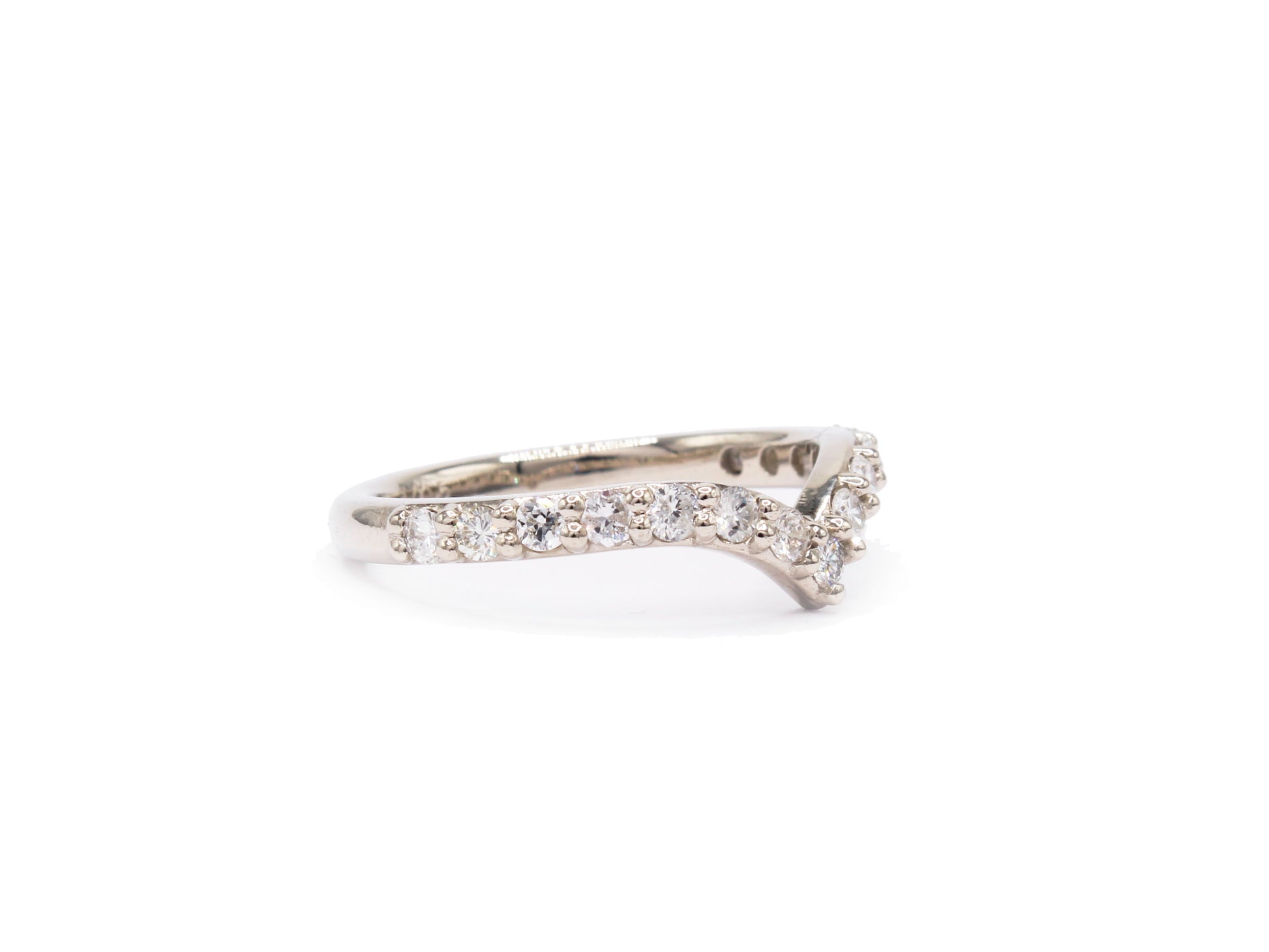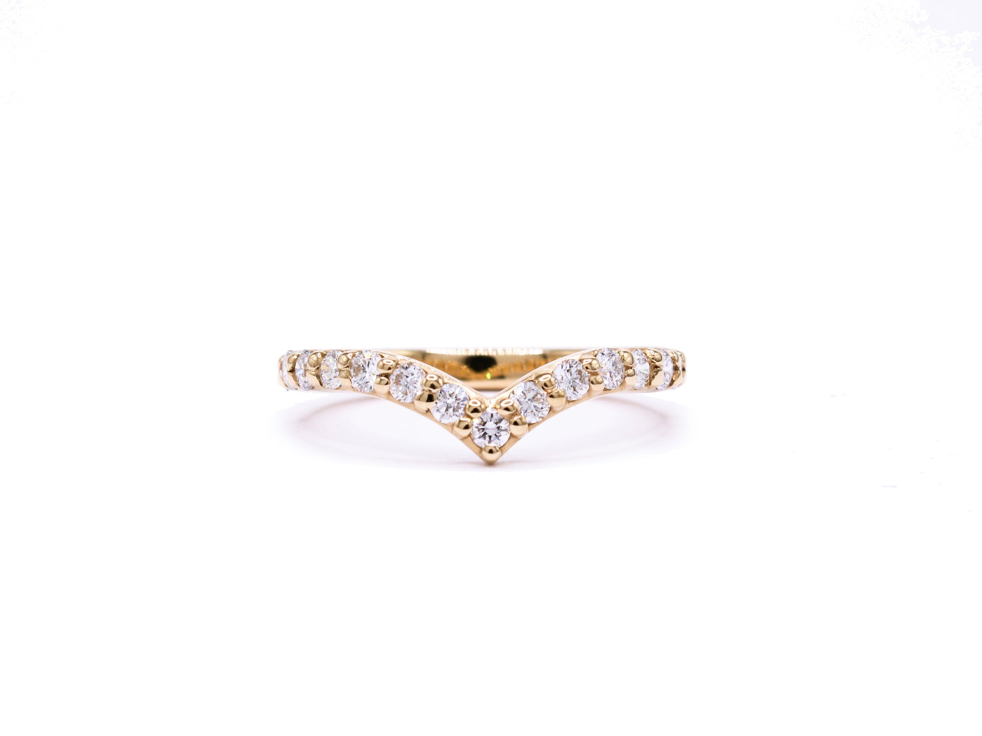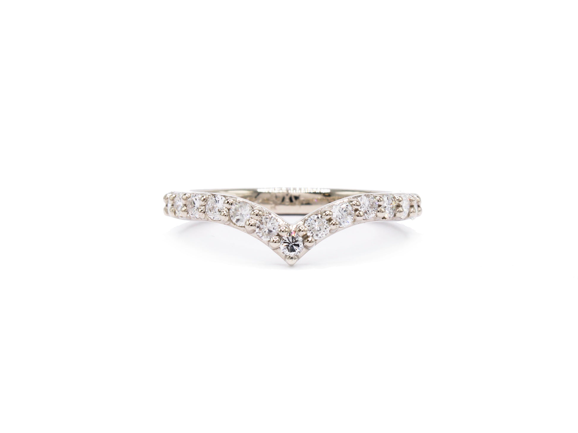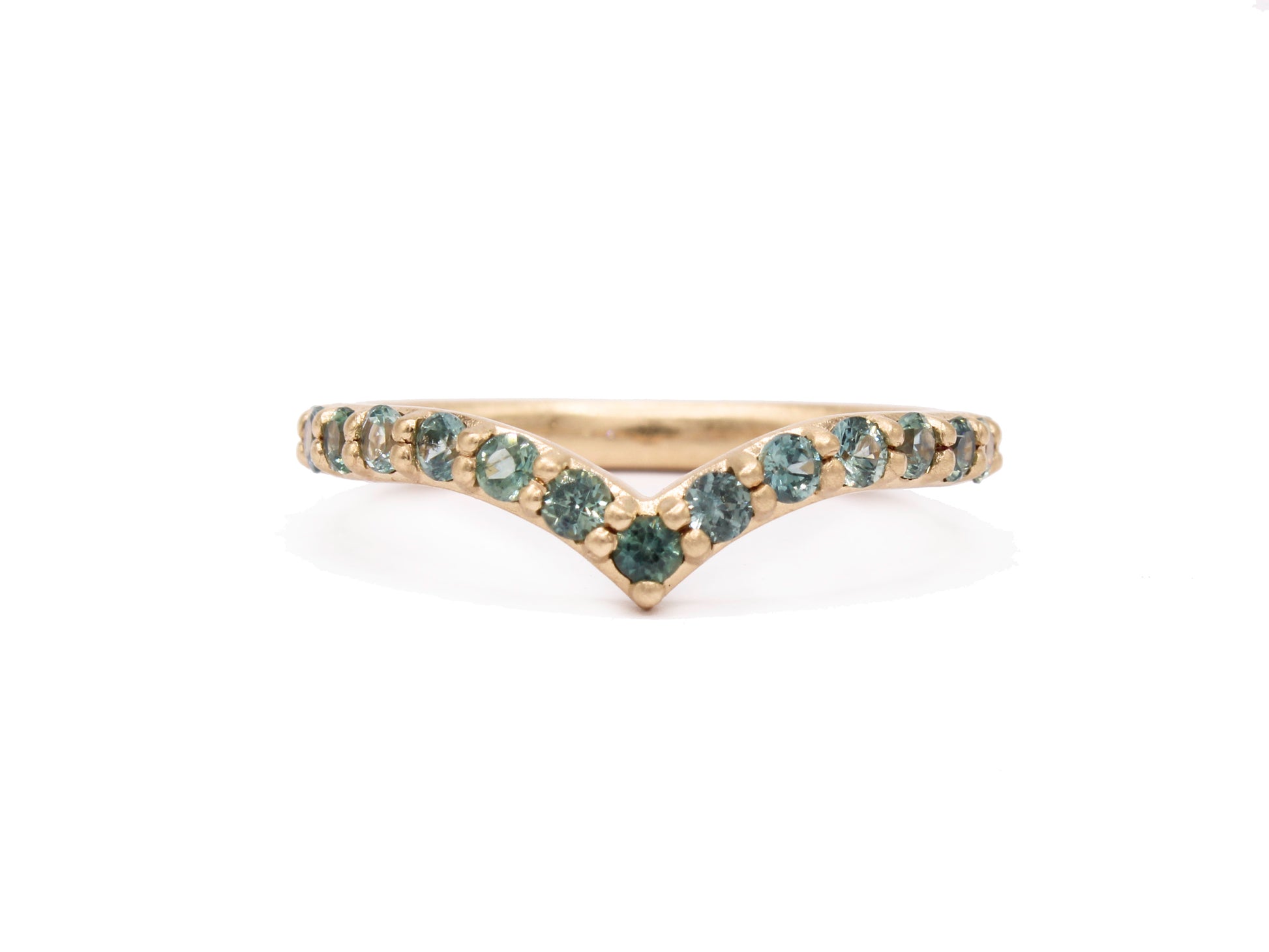 This bold chevron-shaped band adds striking dimension to any ring stack. Its strong, pointed curve creates a beautiful counterbalance to a partial halo or offers a fresh way to shift the composition of a classic solitaire. The possibilities are endless.