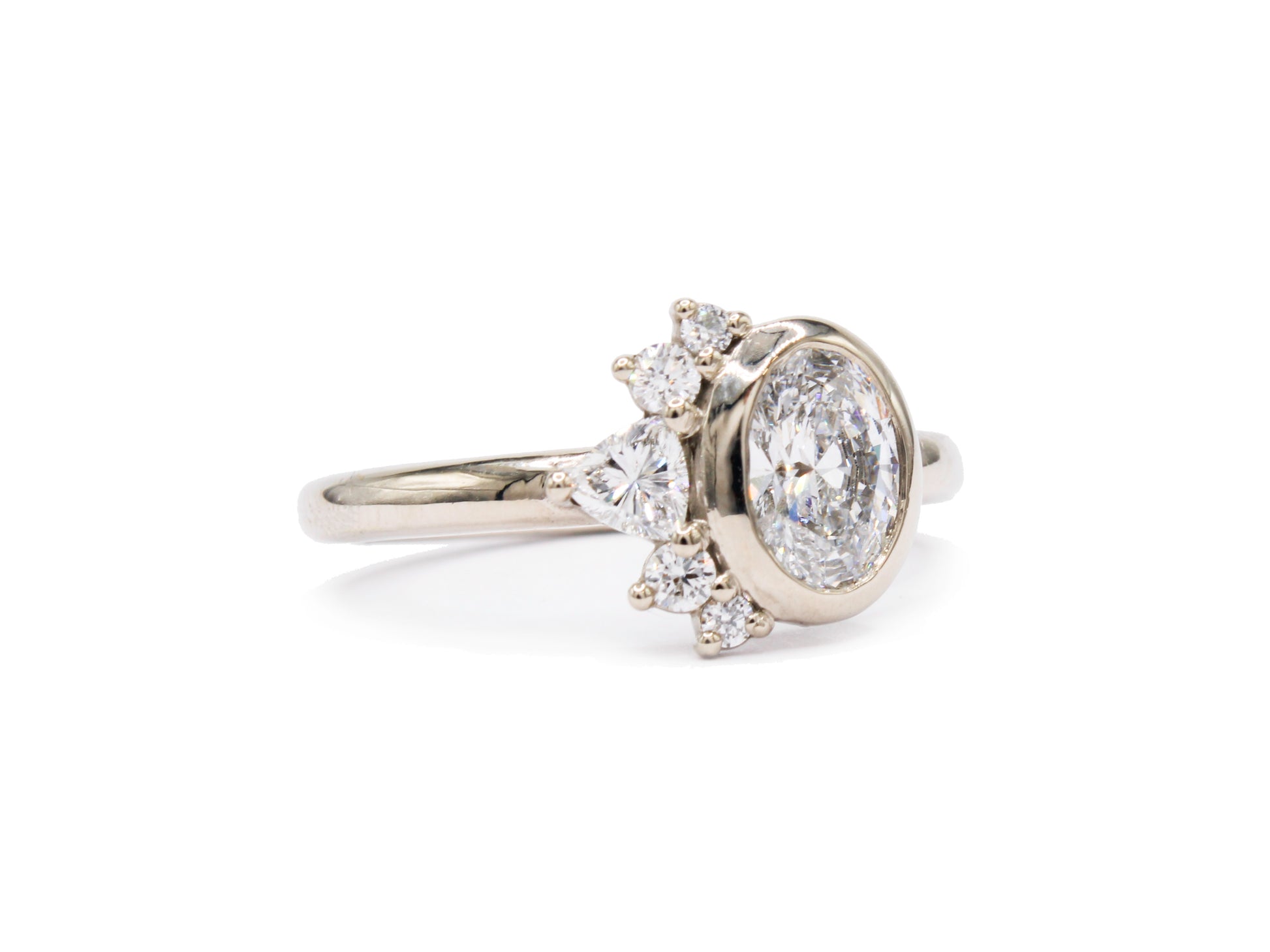 A slender band provides the foundation for this striking, asymmetric design. A bold north/south-set oval center stone is accented by an off-center partial halo of round and trillion-cut gems, creating a composition that feels both modern and romantic.