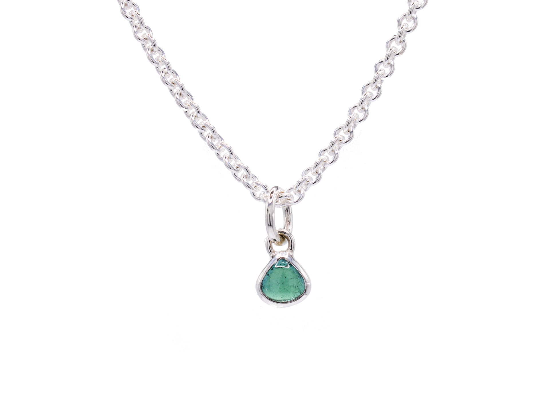 This sweet pendant is a dewdrop of bright green tourmaline. Surrounded by sterling silver and hanging from a large ring, show off this little beauty on your choice of chain thickness and length!