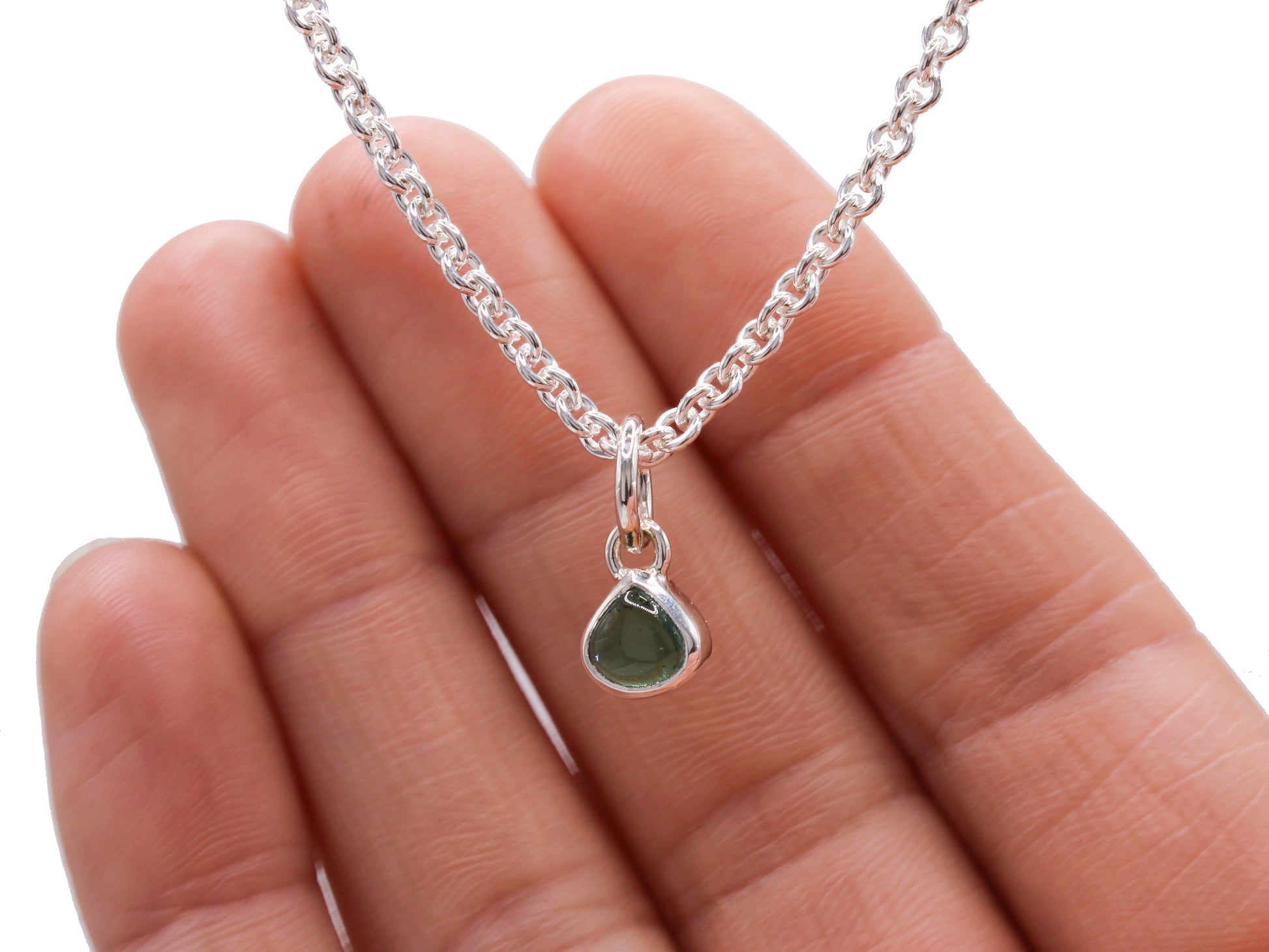 This bright green tourmaline is set in solid sterling silver and hangs from a 1mm wide bail. The total length of the pendant- including bail is 16mm.