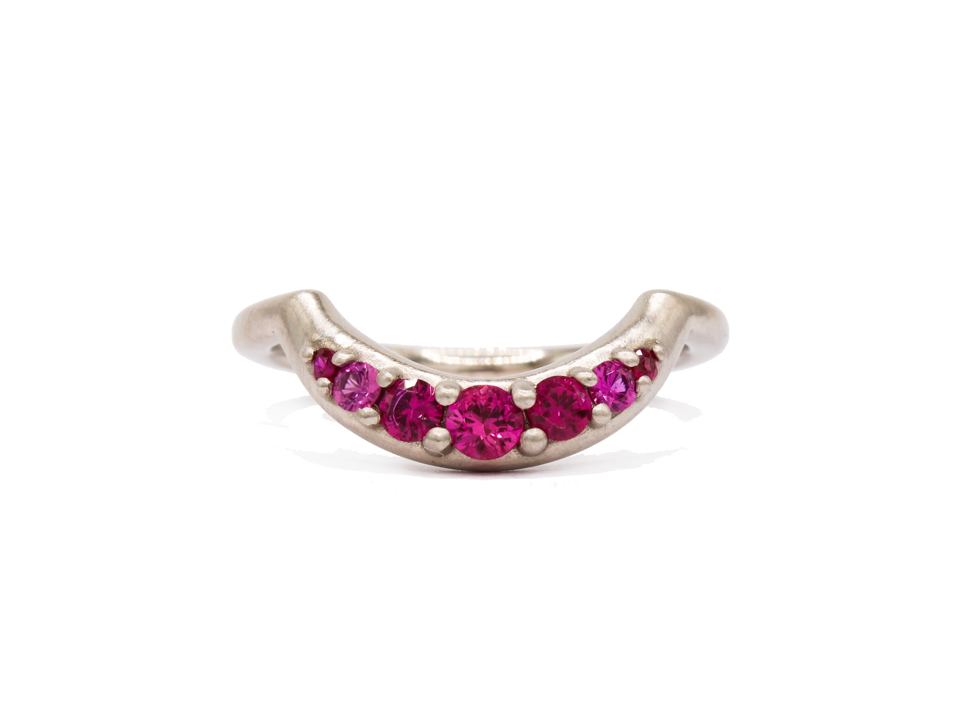 This ready to ship ring is 14kt white gold, set with rubies. This ring is currently a size 7, please allow additional time for ring sizing.